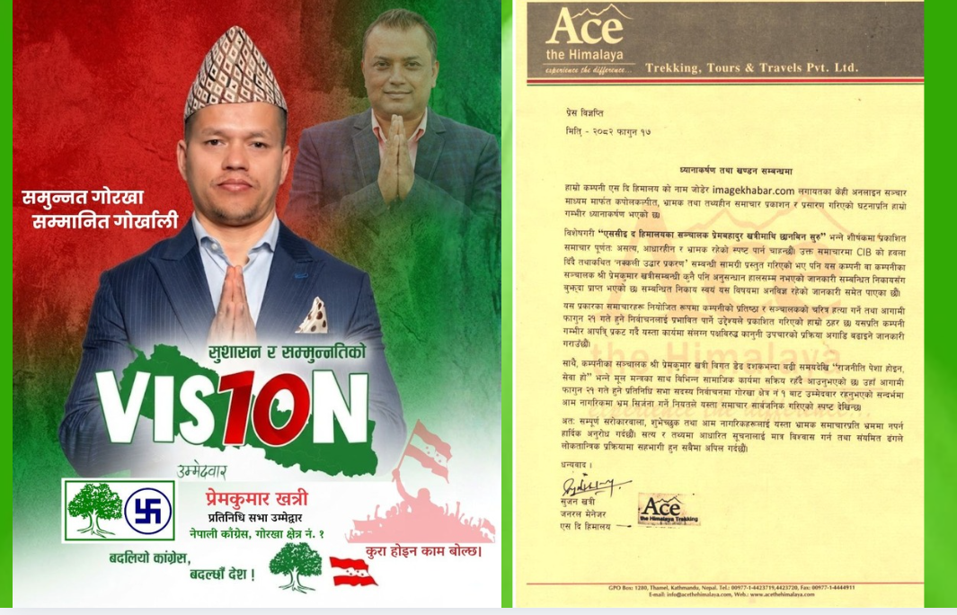 निर्वाचनको मुखमा एक ट्रेकिङ कम्पनी र त्यसका सञ्चालकविरुद्ध प्रकाशित समाचारलाई लिएर विवाद चर्किएको छ। S.D. Himalayan Trekking Company ले आफ्नो कम्पनी तथा सञ्चालकको नाम जोडेर केही अनलाइन सञ्चार माध्यममा प्रकाशित सामग्रीप्रति गम्भीर आपत्ति जनाएको हो।कम्पनीले आइतबार प्रेस विज्ञप्ति जारी गर्दै ImageKhabar.comLaliguras Online लगायतका अनलाइनमा प्रकाशित ‘एससीइ द हिमालयका सञ्चालक प्रेमबहादुर खत्रीमाथि छानबिन सुरु’ शीर्षकको समाचार पूर्णतः असत्य, आधारहीन र भ्रामक रहेको स्पष्ट पारेको छ।कम्पनीका जनरल म्यानेजर सुजन खत्रीद्वारा जारी विज्ञप्तिमा तथाकथित ‘नक्कली उद्धार प्रकरण’ मा Central Investigation Bureau (सीआईबी) ले अनुसन्धान थालेको भन्ने हल्लामा कुनै सत्यता नरहेको उल्लेख गरिएको छ। सम्बन्धित निकायसँग बुझ्दा त्यस्तो कुनै अनुसन्धान वा उजुरी प्रक्रिया अघि नबढेको र स्वयं निकायहरू नै यस विषयमा अनभिज्ञ रहेको दाबी कम्पनीले गरेको छ।