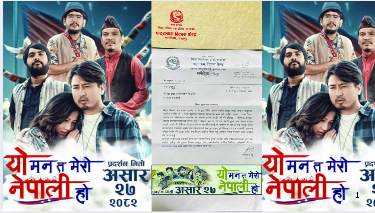 नेपाली भाषा तथा नेपाली संस्कृतिको प्रवर्धन तथा श्रीवृद्धिमा योगदान दिने उद्देश्यले निर्माण गरिएको नेपाली फिल्म ‘यो मन त मेरो नेपाली हो’ को निर्माण संस्थालाई नेपाल सरकारको शिक्षा, विज्ञान तथा प्रविधि मन्त्रालय अन्तर्गतको पाठ्यक्रम विकास केन्द्र सानोठिमी, भक्तपुरले एउटा पत्र प्रेसित गर्दै शुभकामना सन्देश पठाएको छ ।