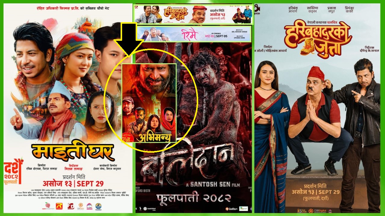 काठमाडौं । नेपाली फिल्म उद्योगमा दशैंको फूलपाती अर्थात् असोज १३ गते ठूलो भिडन्त हुने भएको छ । यस दिन बहुचर्चित तीन नेपाली चलचित्र माईतीघर, हरिबहादुरको जुत्ता र बलिदान सार्वजनिक हुँदै गर्दा अब ‘अभिमन्यु : च्याप्टर १’ पनि त्यही दिन प्रदर्शनमा आउने भएको छ ।![]()